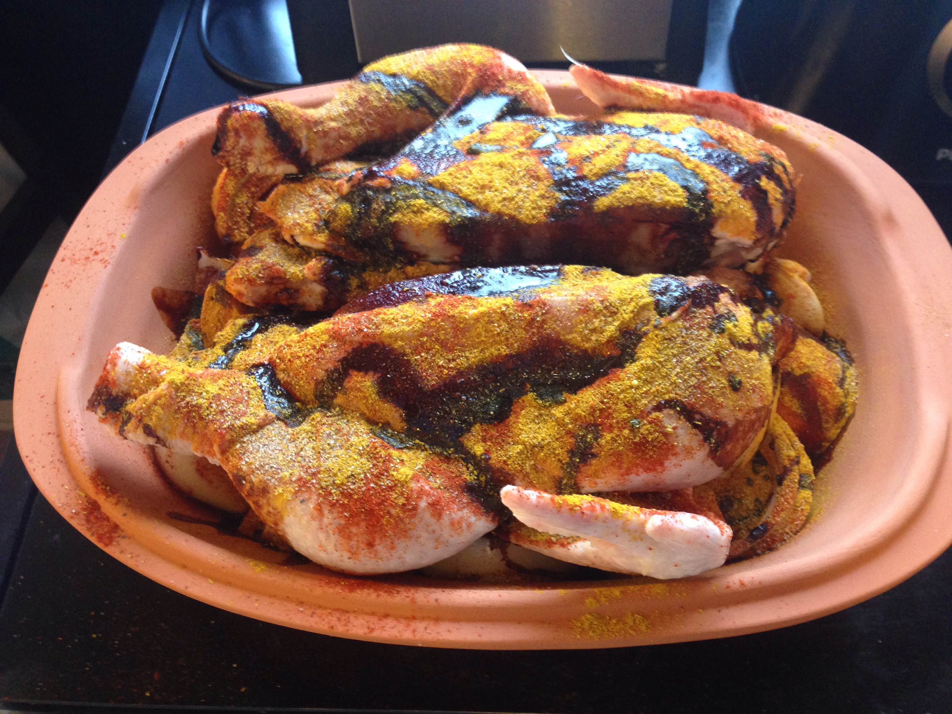 7. Lägg sedan på kycklinghalvorna och krydda likadant igen. Inget extra salt behövs. Om du är ambitiös kan du pensla soyan på kycklingen för jämnare lager.