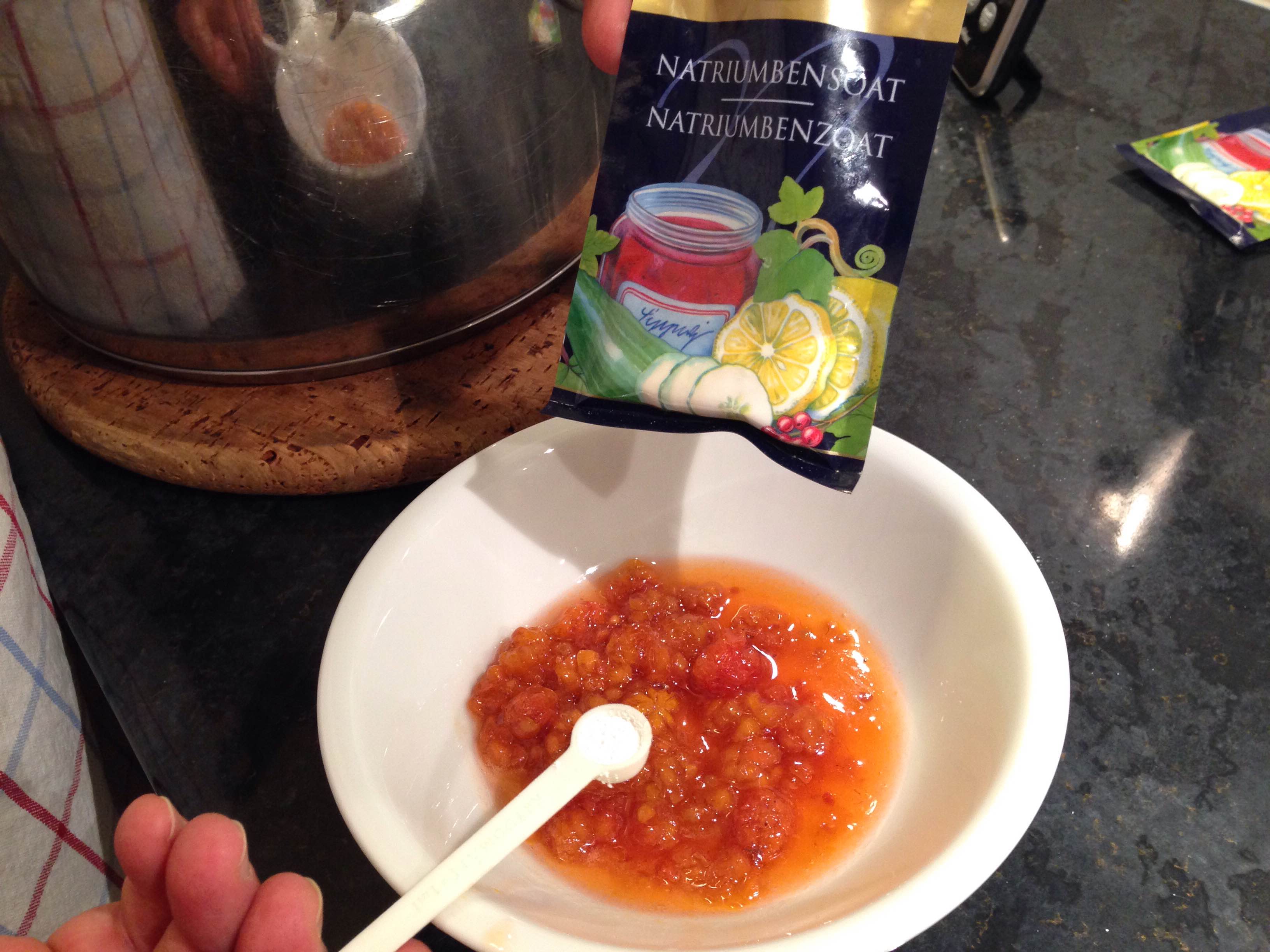 7. Ta av lite sylt i en separat skål och blanda i natriumbensoaten och citronsyran. Blanda sedan ihop allt (obs! koka inte ihop, då blir det beskt).