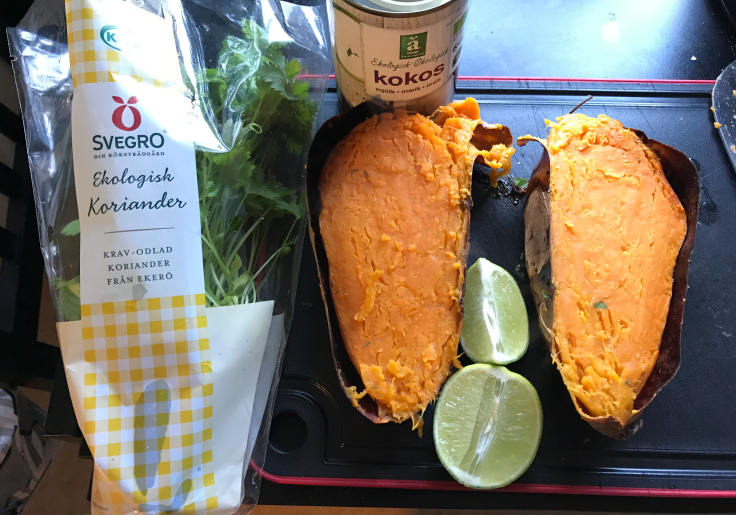 - Baka sötpotatisen i ugnen i cirka 40-60 minuter (beroende på storlek). Finhacka chilin och grovhacka koriandern medan du väntar.
