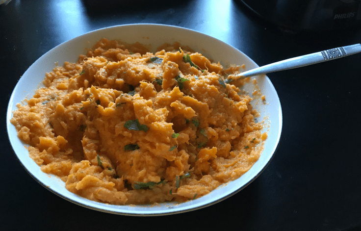 - Mosa sötpotatisen tillsammans med kokosmjölken och den hackade chilin. Tänk på att anpassa mängden mjölk utifrån personlig preferens.
