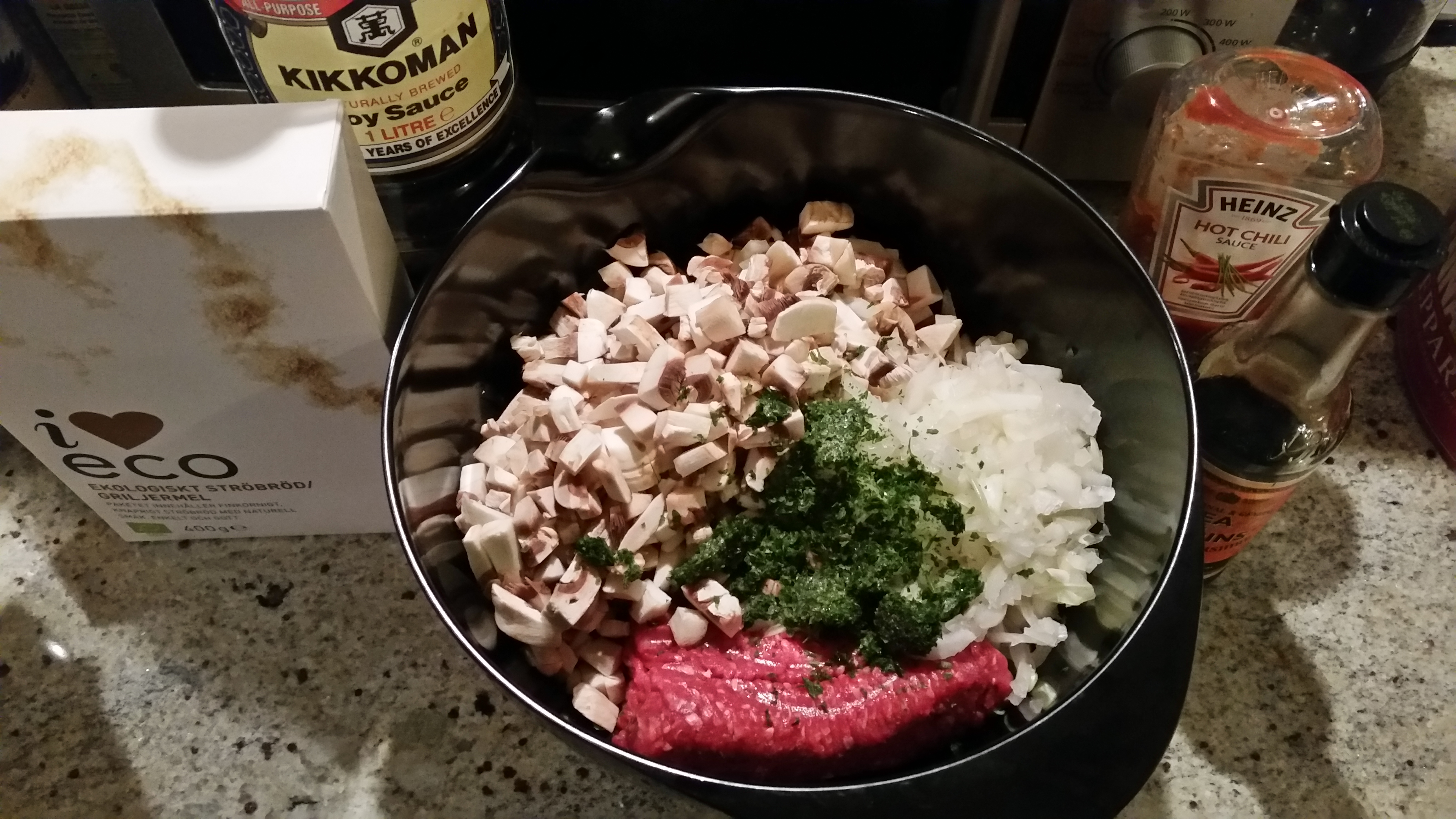 2:hacka resten av löken, blanda ihop med persilja, köttfärs ochhackade champinjoner.