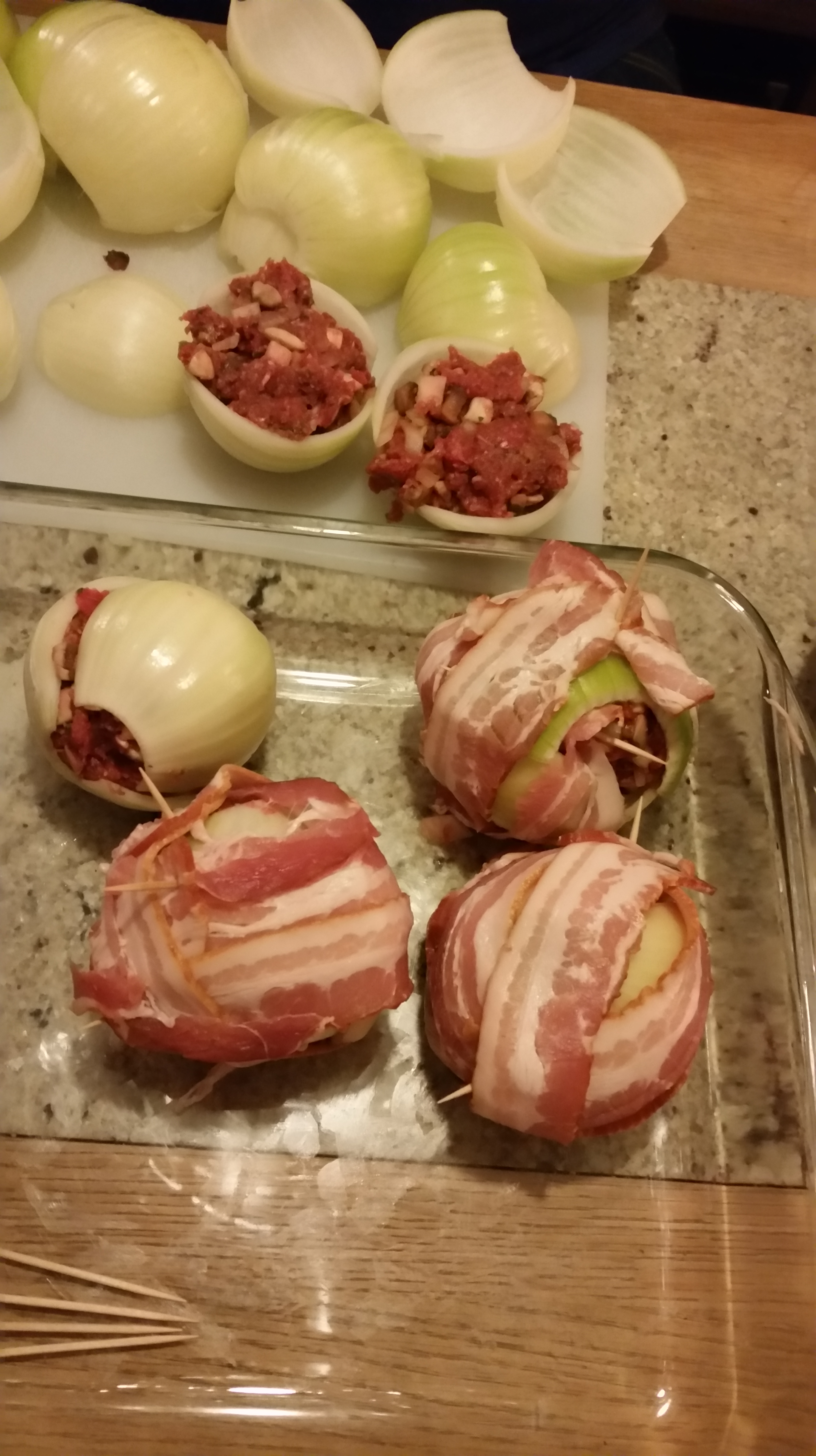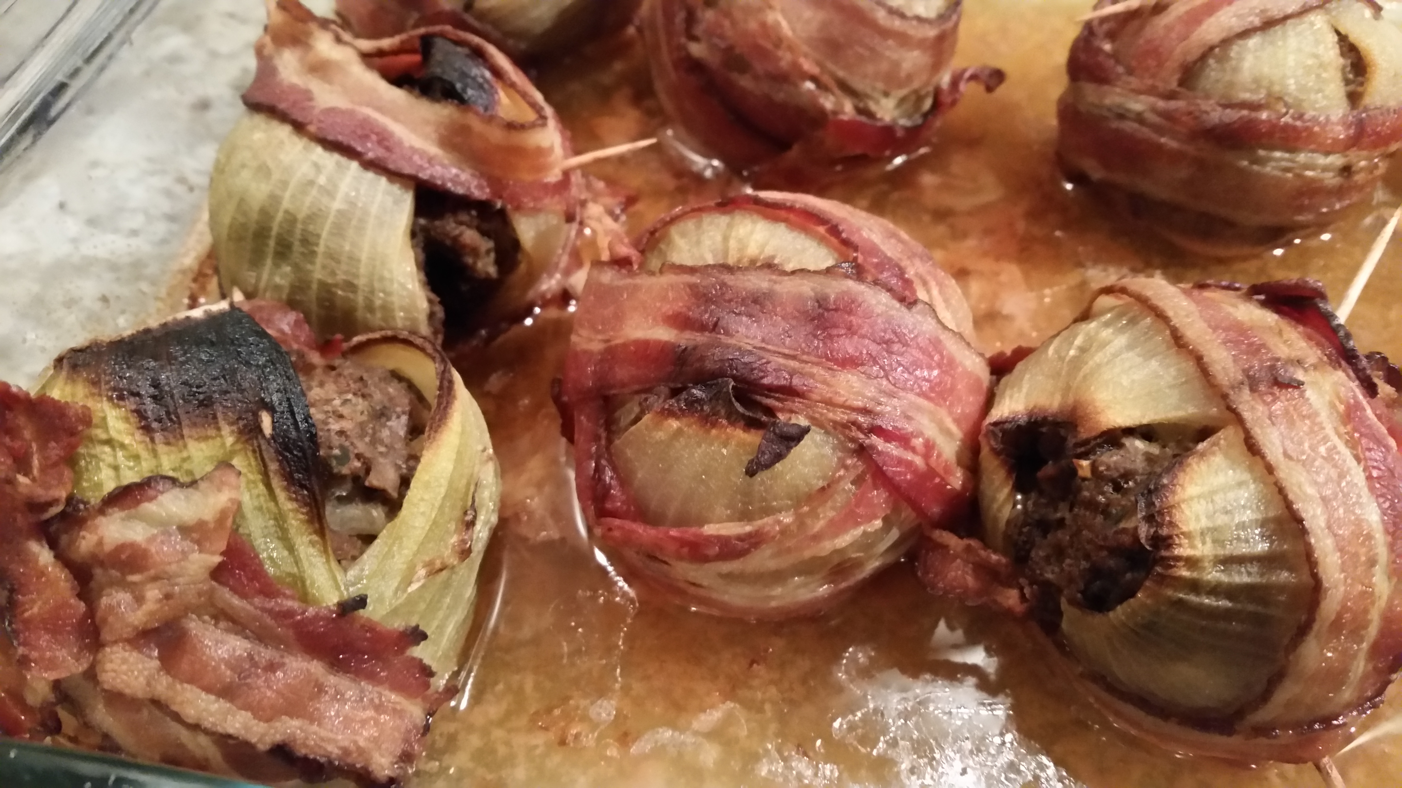 Dessa baconlindade lökar fyllda med köttfärs kan ätas både varma och kalla. Smidig utflyktsmat eller som en rätt på julbordet. Äter man den kall kan man ev. öka mängden chili för att ge den lite sting.