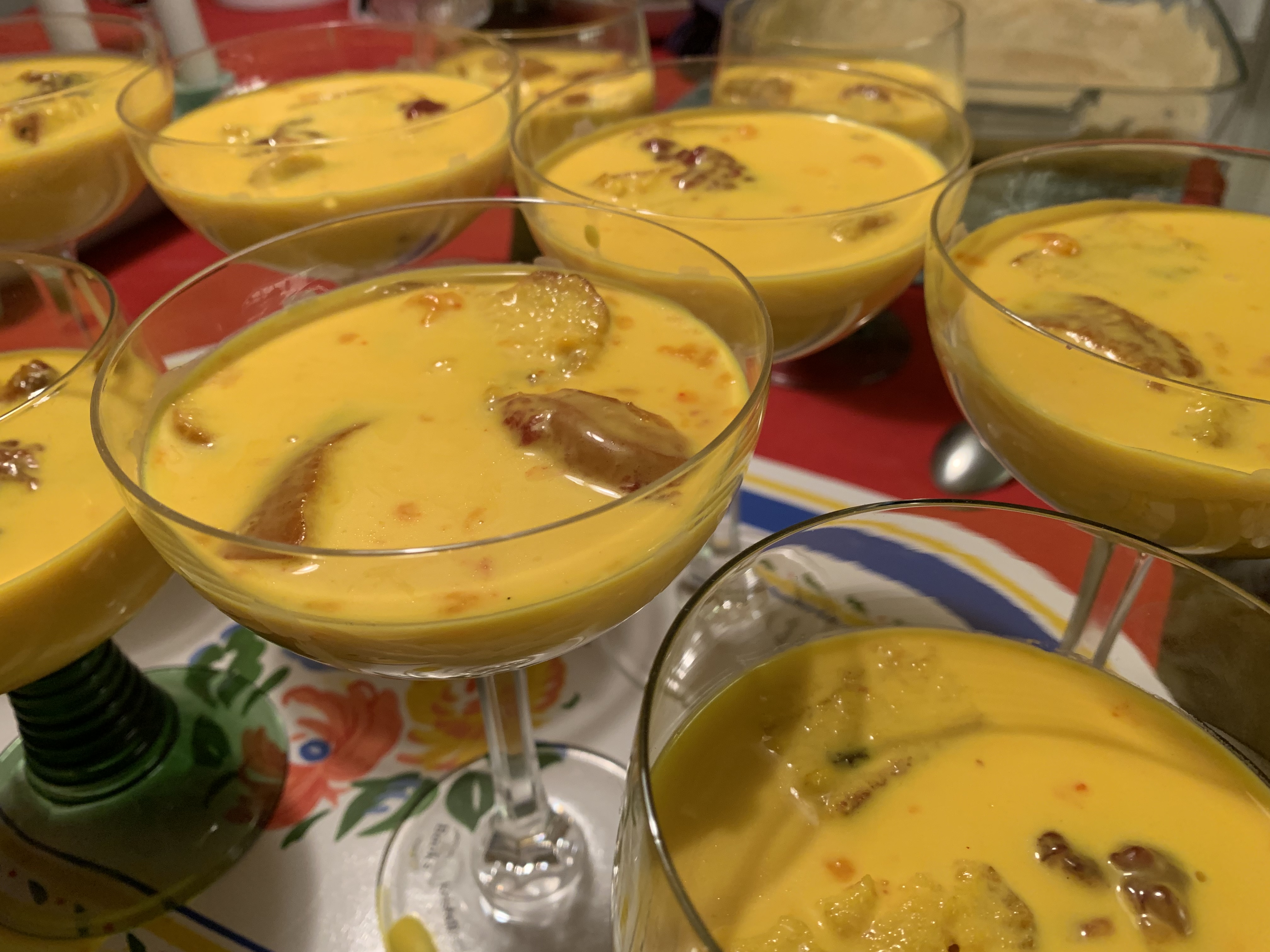 - Lägg ner gelatinet/vegogelet i gräddblandningen så att de smälter. Smaka av vätskan och tillsätt vaniljsockret och saffran efter tycke.