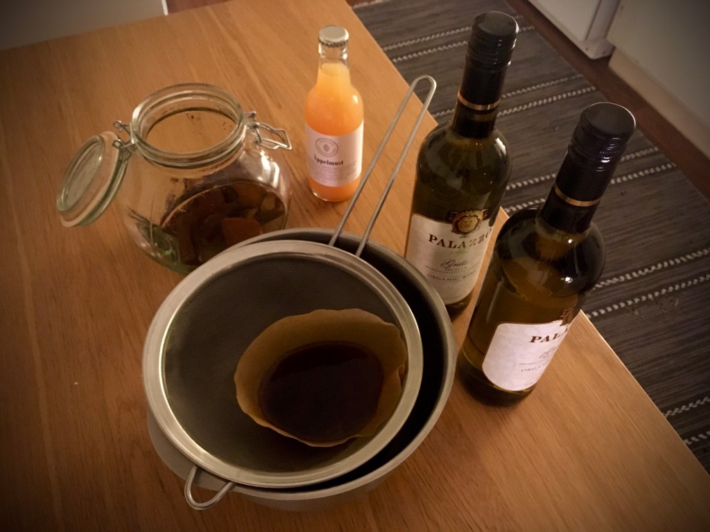 2. Sila av glöggkryddorna genom ett kaffefilter så att glöggen får fin färg. Detta kan ta en liten stund…
